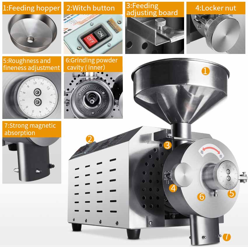 5.The slope of grinding cavity,which is located on the position of fixed pulverizing blade,adopts scientific design to further guarantee the fineness of milling powder in order to reach instant taste effect entering the mouth.