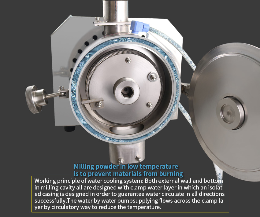 水冷工作原理:磨粉腔外壁和磨粉腔底部都設(shè)計(jì)有一個夾水層,夾層里設(shè)有隔套,保證水能夠循環(huán),沒有死角。通過水泵送水,使水在夾層里循環(huán)流動降溫。