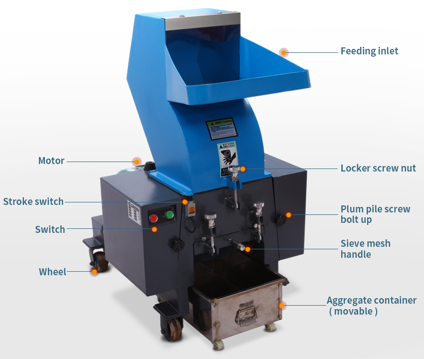 ★ Plastic crushing machine in common adopts seal-ring shaft.This kind of seal-ring design makes the shaft work in good condition for a long time.The design of knife is reasonable,which can guarantee even particles of finished objects.The knife seat adopts design of thermal forming treatment,whose outlook is beautiful and generous.