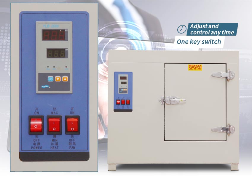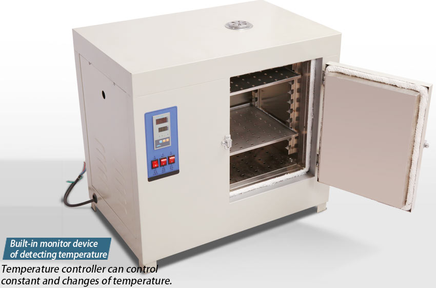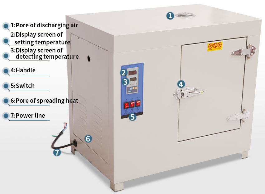 Heating wires are installed under working chamber of the machine and air blast devices are fixed on the left of working chamber.Temperature controller can control constant and changes of temperature.When working,air flows into working chamber from air pore of the machine bottom.Air passes heating wires and air blast devices,flows into working chamber and discharge air from air pore of top of the machine in the end.Preserving material is glass fiber which is embedded between working chamber of the machine and outer shell made of steel.