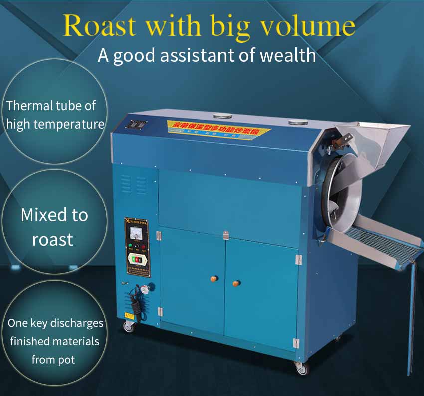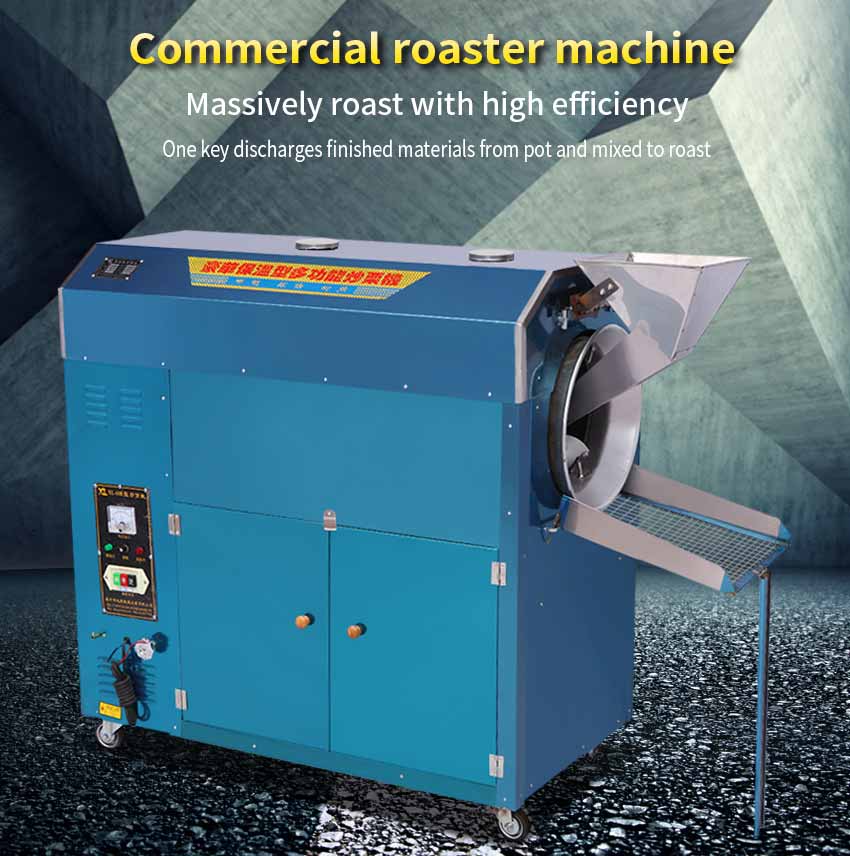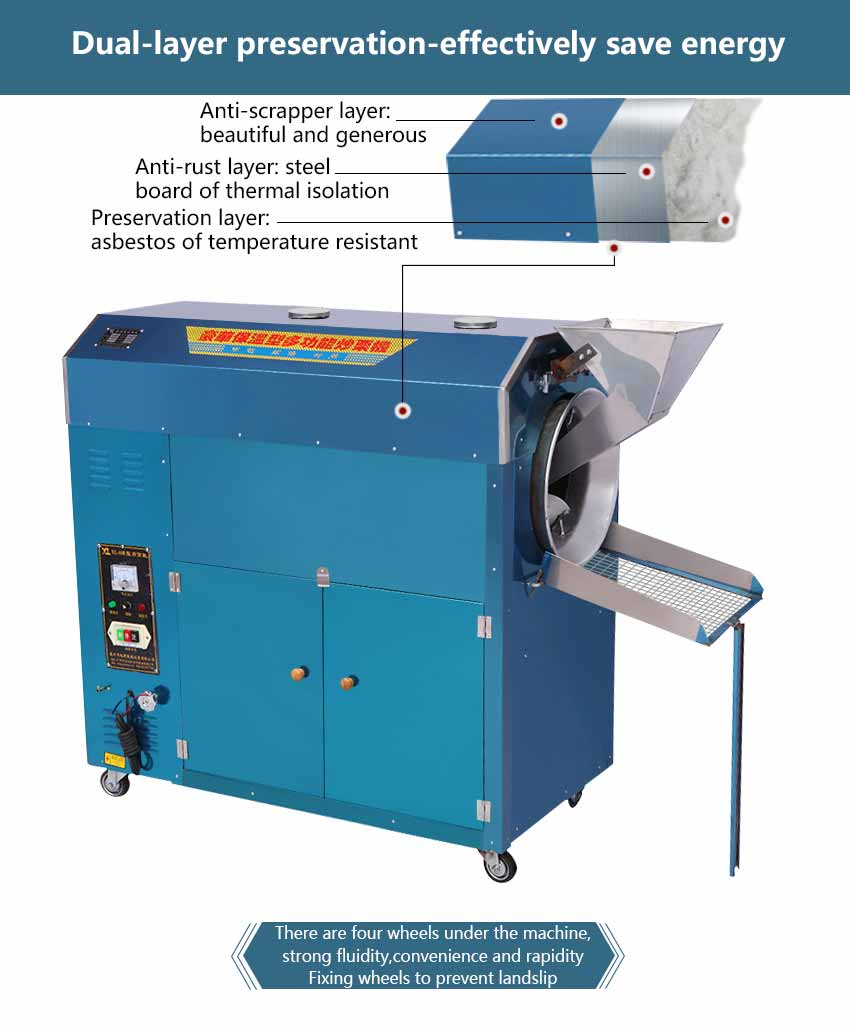 The roaster machine by gas heating equips with stove of saving energy which can adjust temperature level of fire force.The roaster machine by electricity heating equips with temperature controller which can adjust temperature freely.