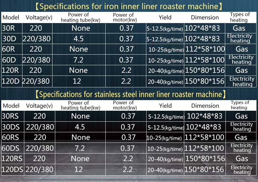 Three types of roaster machine manufactured by Xulang company are type 30,type 60 and type 120.Any one of three types has two ways of heating,gas heating and electricity heating.Roaster