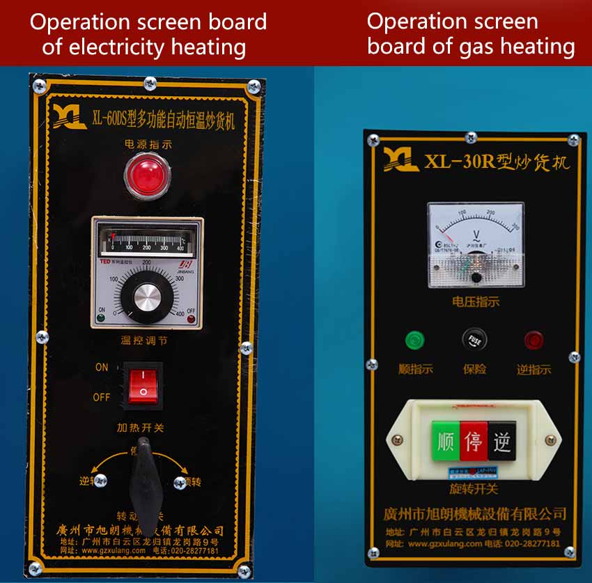 1. Three types of roaster machine manufactured by Xulang company are type 30,type 60 and type 120.Any one of three types has two ways of heating,gas heating and electricity heating.