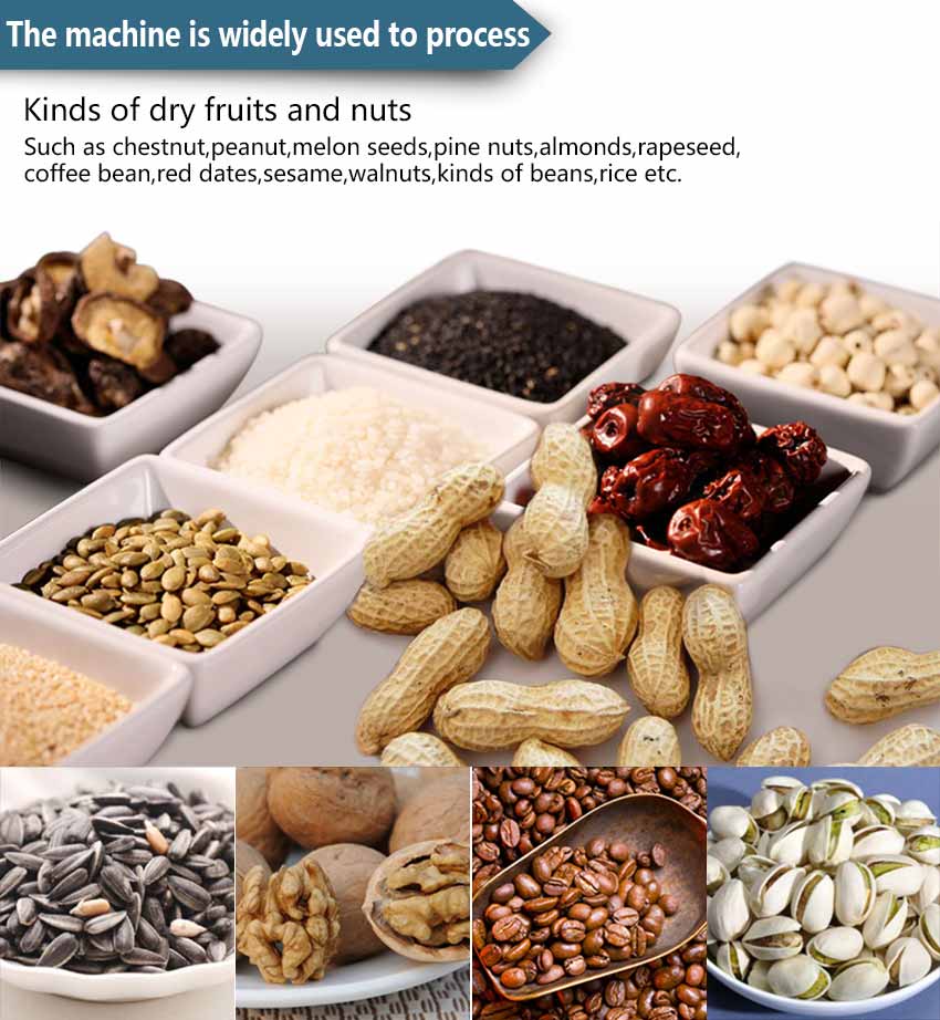 7.The machine is suitable to process kinds of dry fruits and nuts,such as chestnut,peanut,melon seeds,pine nuts,hazelnut,almonds,rapeseed,coffee bean,red dates,sesame,walnuts,kinds of beans,wheat,rice etc.The machine is also used to process in certain site and go business in the places of shopping malls,supermarket,professional sale shops of foodstuff,chain shops,street delicacy etc,and it is a good assistant of wealth in business.
