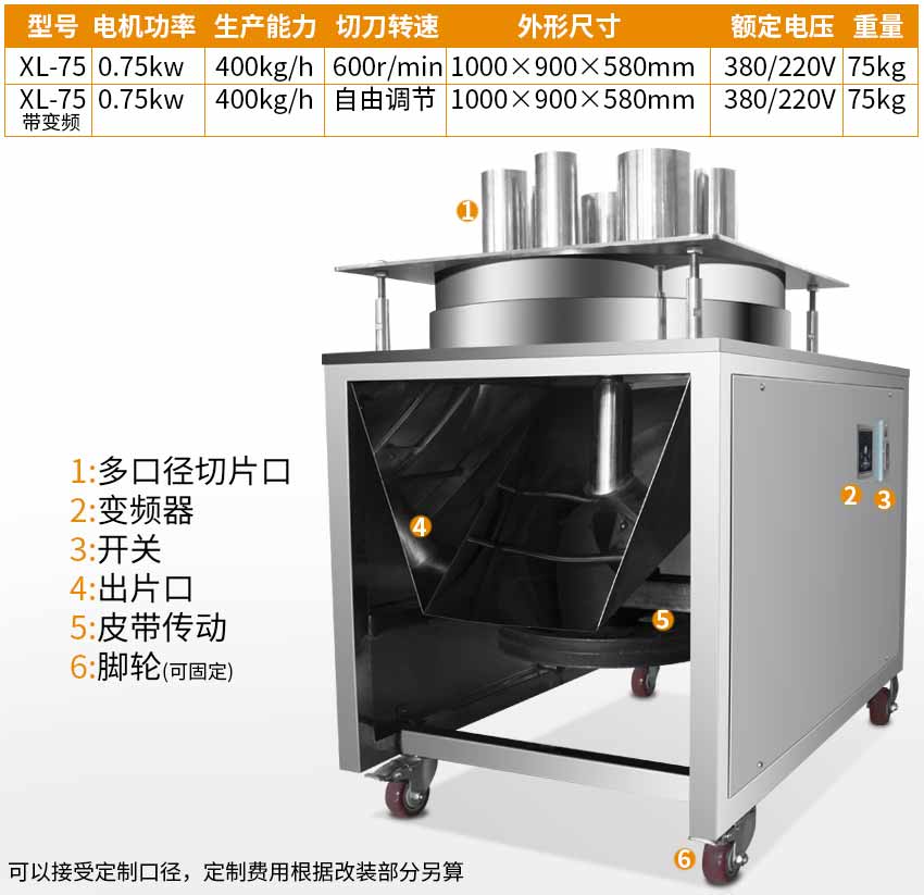 廣州市旭朗機(jī)械設(shè)備有限公司生產(chǎn)的XL-75型多能切片機(jī)采用旋轉(zhuǎn)的刀盤切削,可以將淮山、蓮藕、木薯、紅薯(地瓜)、蘿卜黃瓜、苦瓜、土豆等農(nóng)產(chǎn)品加工成片狀,具有切面質(zhì)量好,制品厚薄及大小均勻、切面組織新鮮、不破壞纖維組織。同時(shí)該機(jī)切片效率高、操作方便、能耗低、衛(wèi)生、安全、高效,是農(nóng)產(chǎn)品加工的理想設(shè)備。主要有機(jī)架、旋轉(zhuǎn)刀盤、傳動(dòng)部分、電機(jī)、出料口等組成,適于體積中等、呈長條圓柱狀的物料(如淮山、蓮藕、木薯、紅薯(地瓜)、蘿卜)的切片。本機(jī)與農(nóng)產(chǎn)品接觸部位均采用鋁合金及不銹鋼材料制作,保證長期工作不銹、不蝕、無毒、無害,符合食品加工機(jī)械衛(wèi)生要求。