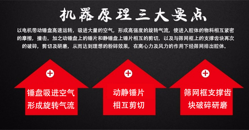 以電機(jī)帶動錘盤高速運轉(zhuǎn),吸進(jìn)大量的空氣,形成高強(qiáng)度的旋轉(zhuǎn)氣流,使進(jìn)入腔體的物料相互緊密的摩擦,撞擊。加之動錘盤上的錘片和靜錘盤上錘片相互的剪切,以及與篩網(wǎng)框上的支撐齒塊再次的破碎,剪切及研磨,從而達(dá)到理想的粉碎效果,在離心力及風(fēng)力的作用下經(jīng)篩網(wǎng)排出腔體。