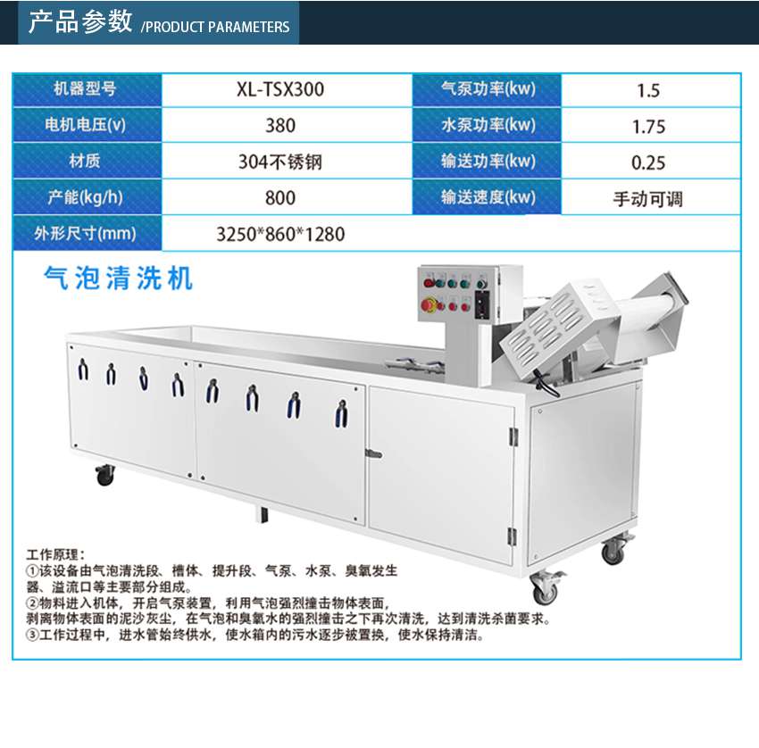 采用不銹鋼制造而成、堅固耐用、設(shè)備原料不會受損傷,從而達(dá)到洗潔凈高、節(jié)省勞力、節(jié)水、設(shè)備 性穩(wěn)定,可靠等效果。被清洗物潔凈高出人工常規(guī)洗法三倍以上。 本機(jī)采用高壓水流和氣泡發(fā)生裝置沖擊被清洗物體表面,氣泡在與物體接觸時破裂產(chǎn)生的能量,會對被清洗物體表面起到一個沖擊和刷洗的作用,刷洗被清洗物體表面,將被清洗物體清洗干凈。